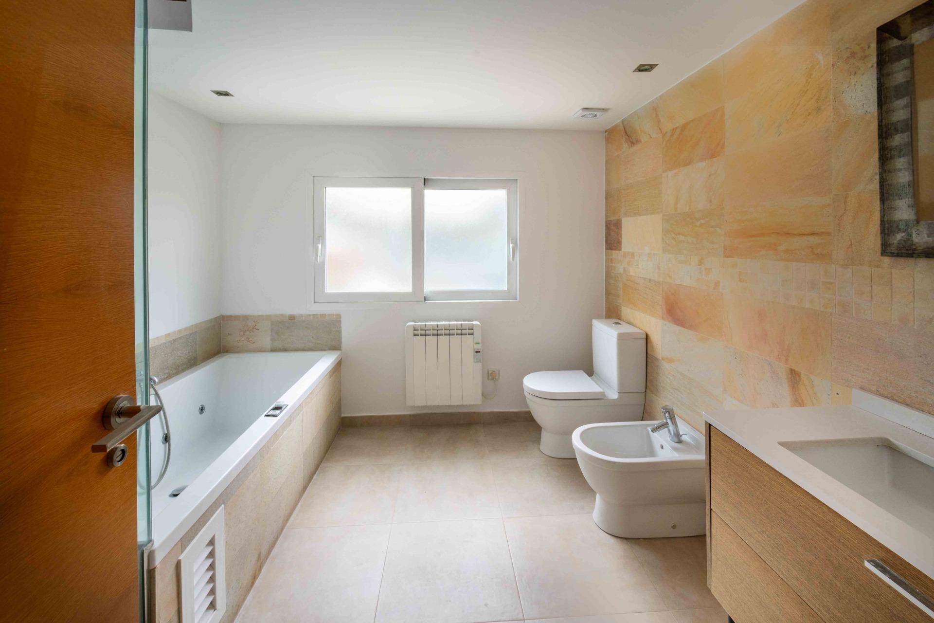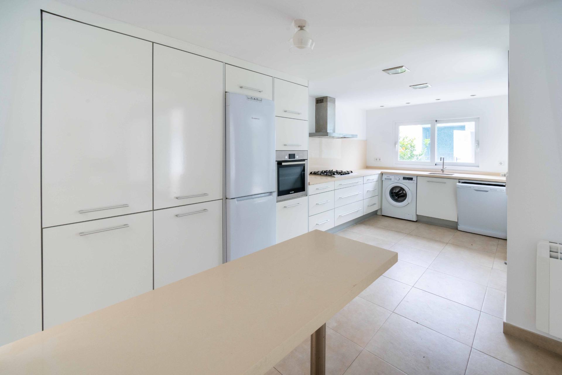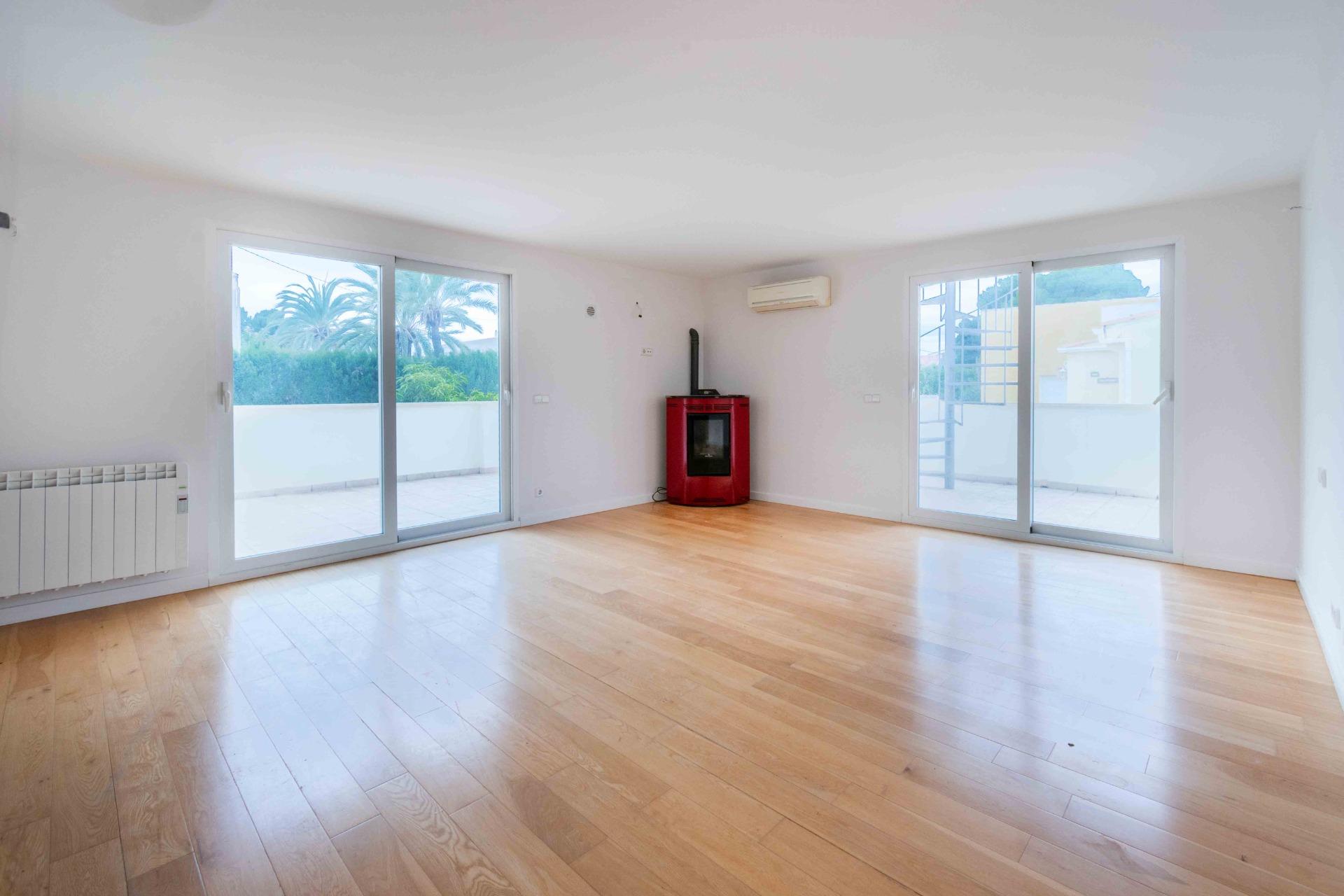 Spacious and renovated semi-detached chalet with large rooms and a total surface area of 250m2 distributed over 2 floors with 4 bedrooms, pool, parking for several vehicles, large solarium on the roof, and a plot of almost 400m2 in the heart of Albir.~~On the ground floor, we enter the house directly into the large living room of 30m2 with a large window at the front of the house, which gives it a lot of light. On this floor, we also have a dining room of 30m2 and the semi-independent kitchen with a bar equipped with top brand appliances. The dining room also opens to the covered and glazed exterior terrace with a glass curtain, making it an additional living room that leads directly to the backyard and the pool. On the same floor, we have a double room with built-in wardrobe and natural light, and a full bathroom with shower.~~On the upper floor, we have the main room of 28m2 with a pellet stove, ensuite bathroom with bath and shower, and dressing room. The entire room opens to the upper terrace on two sides, providing a lot of brightness. On the same floor, we have two more very spacious rooms with direct access to the terrace and built-in wardrobes, as well as another full bathroom.~~The upper terrace surrounds the house and provides access to the large solarium on the roof of the property.~~The plot of almost 390m2 has a pool with waterfalls at the back, patio, fruit trees, storage room, and a shower. On the side, it forms a corridor that connects both ends, and at the front, we have a patio and parking for several vehicles.~~The house is located on a quiet dead-end street, so only neighbors have access. The main avenue of Albir is only 100m from the house, with public transport, restaurants, shops, medical centers, and supermarkets very close, as well as the weekly market.~~The property is sold unfurnished.