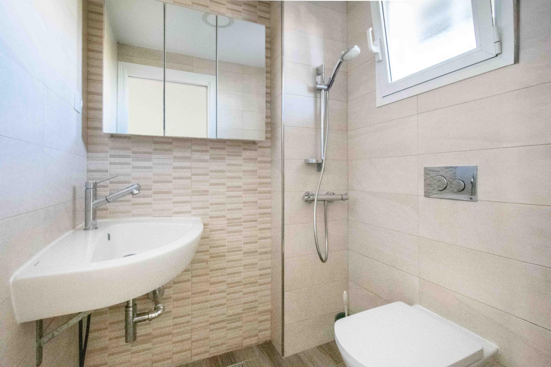 The ground floor offers a spacious 30m² living-dining area with direct access to a south-facing outdoor patio. The bright, independent 12m² kitchen is fully furnished and equipped. A guest toilet is also present.