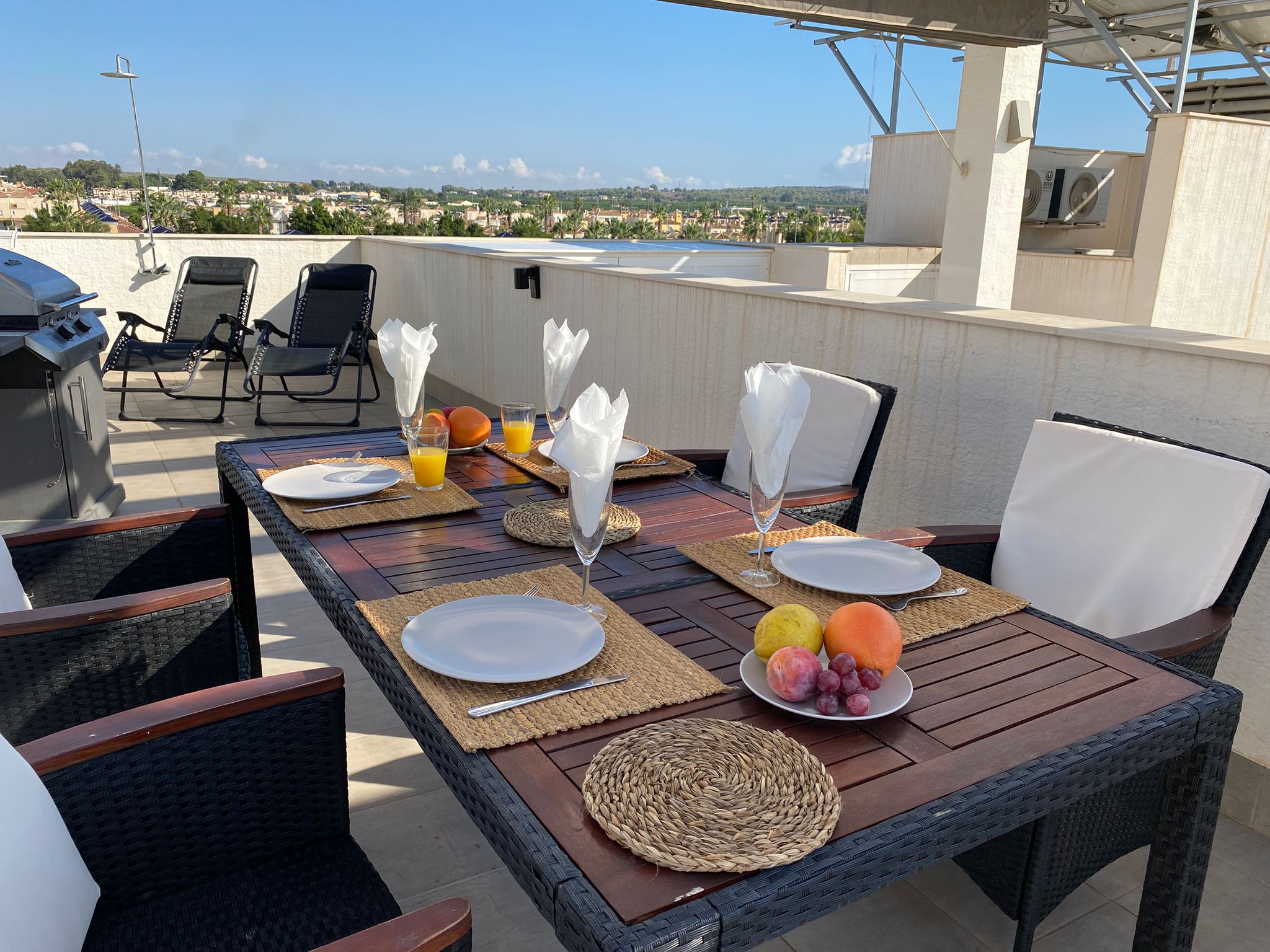 Are you dreaming of a modern holiday home in Spain where luxury, comfort, and tranquility meet? This elegant penthouse apartment has it all – a spacious private rooftop terrace, stylish interiors, fantastic communal facilities, and a unique location close to the famous La Mata salt lake.